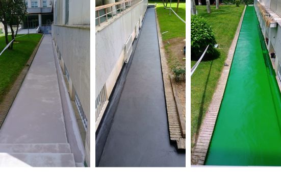 Suelo de Material Epoxi: Con la base preparada, aplicamos una capa de suelo epoxi. Este material es conocido por su durabilidad, resistencia y facilidad de mantenimiento, lo que lo convierte en una opción ideal para áreas de alto tránsito como los pasillos de acceso a un edificio.